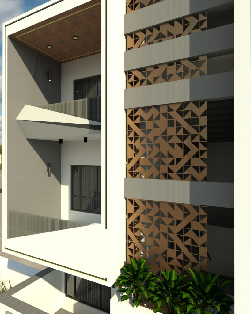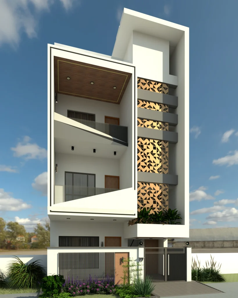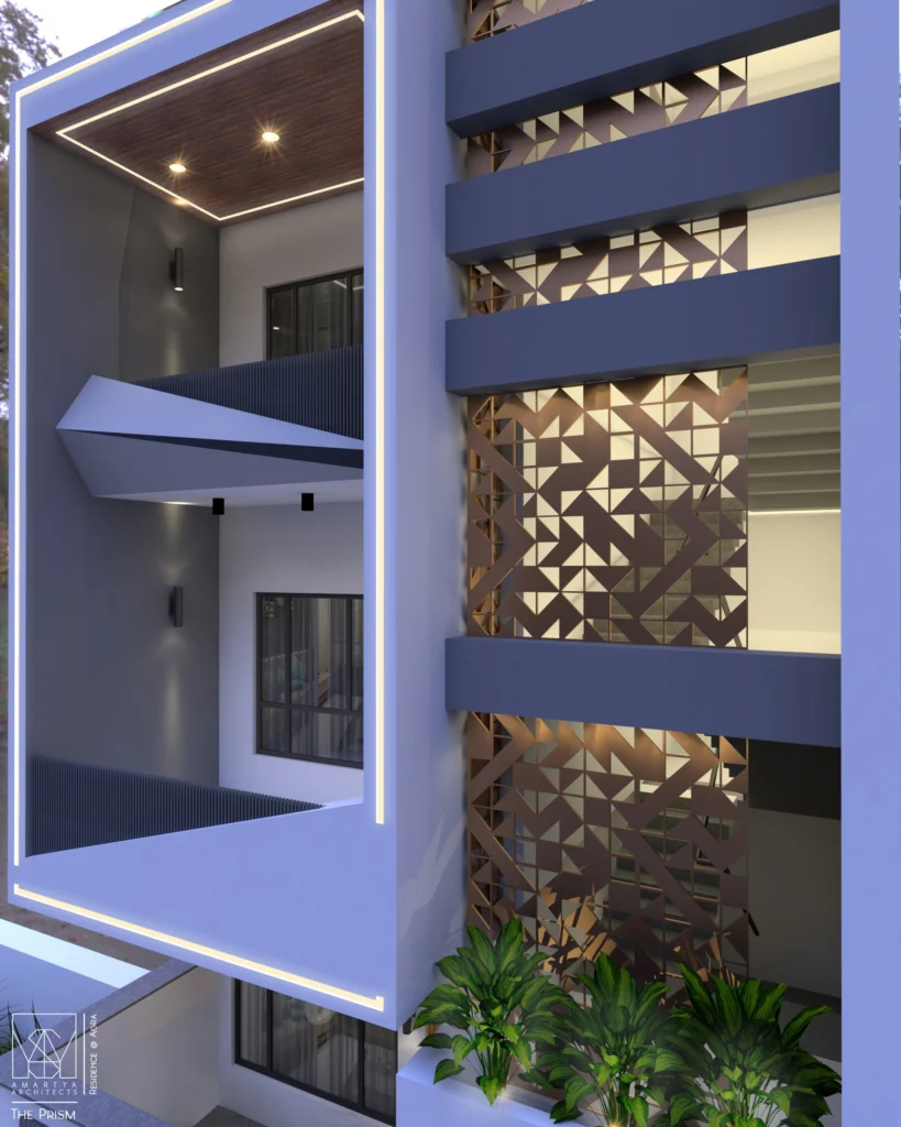 Modern residential house elevation with geometric facade and balconies designed by Amartya Architects, showcasing expertise of best residential architects and modern architects near me