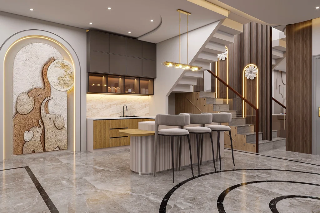 Luxury residential interior with open kitchen, staircase, and designer lighting by Amartya Architects