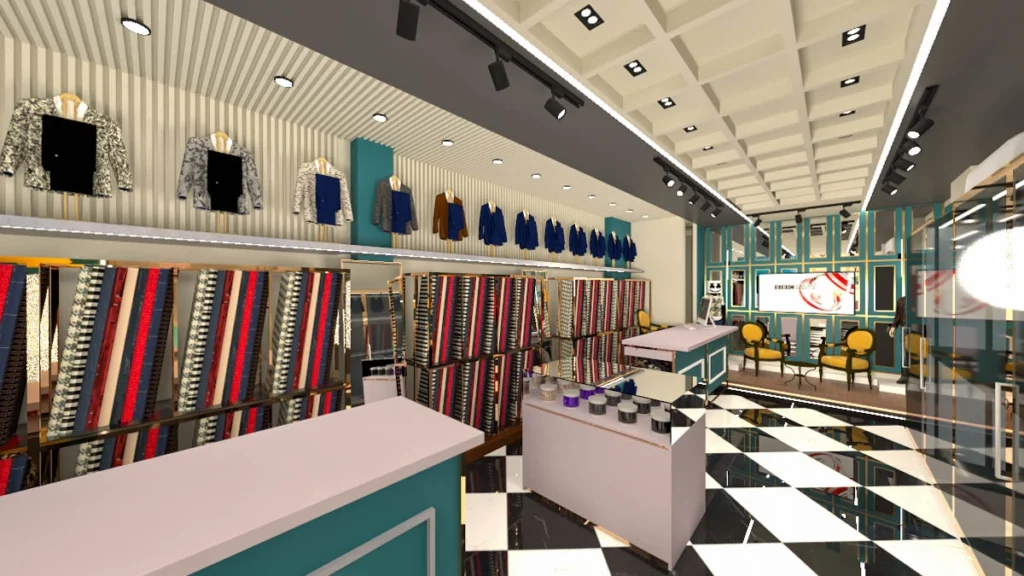Luxury garment showroom interior design featuring jacket displays, fabric shelves, and bespoke retail layout