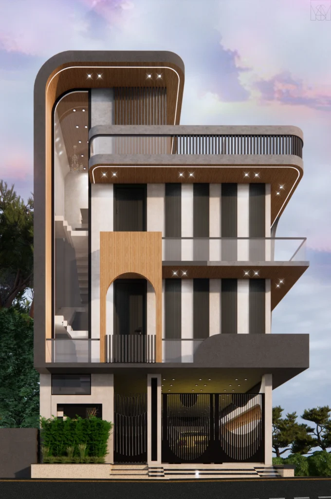 Modern residential building exterior design by Amartya Architects featuring curved balconies, glass railings, warm wooden cladding and contemporary urban façade with elegant lighting.